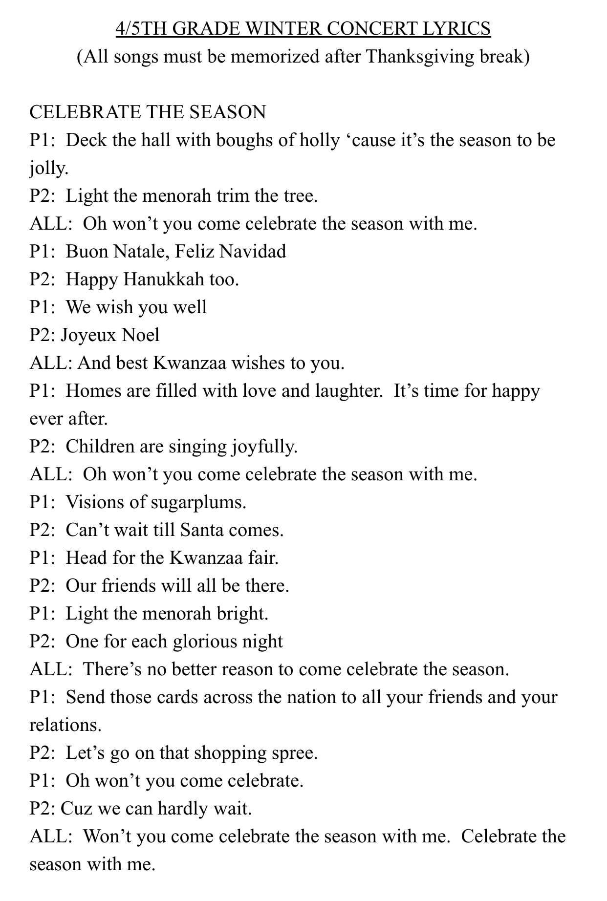 November 14, 2017 Spintoliz 4/5th Grade Winter Concert Lyrics Share this: Share on Facebook (Opens in new window) Facebook Share on X (Opens in new window) X Like Loading...