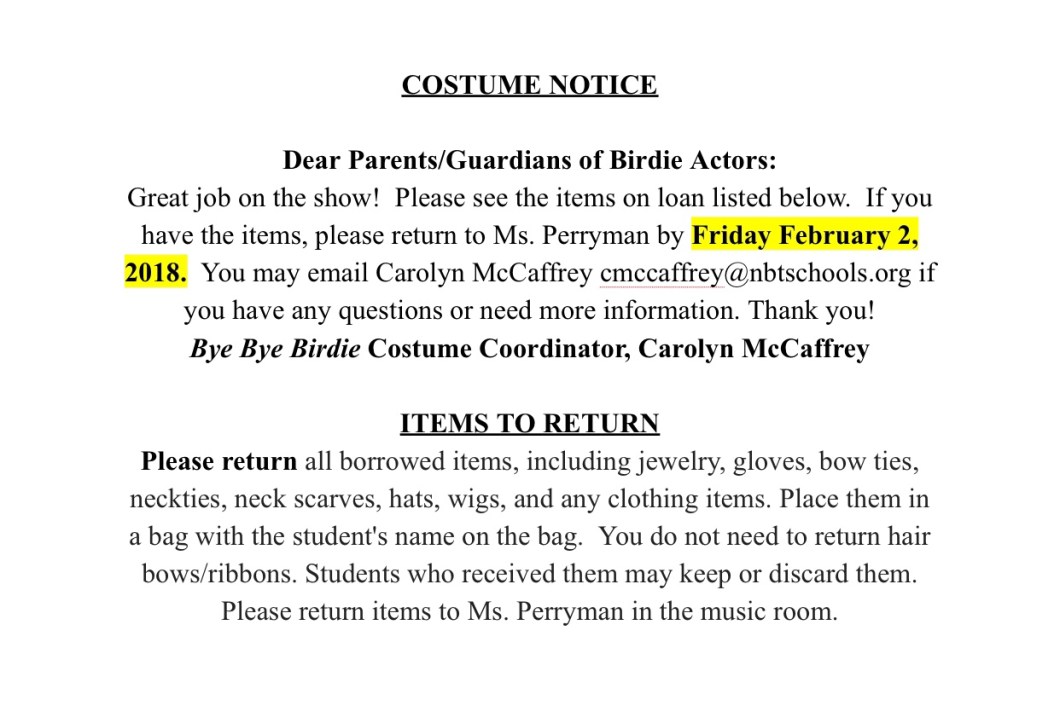 If you borrowed any costume items (see below) please return to Ms Perryman’s room as soon as possible.