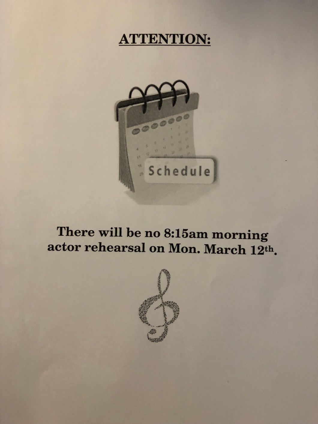 March 9, 2018 Spintoliz No Monday 3.12 @ 8:15 Reminder: There will be no morning actor rehearsal this coming Monday. Make sure you know your cues and lines well. 😊 Share this: Share on Facebook (Opens in new window) Facebook Share on X (Opens in new window) X Like Loading...