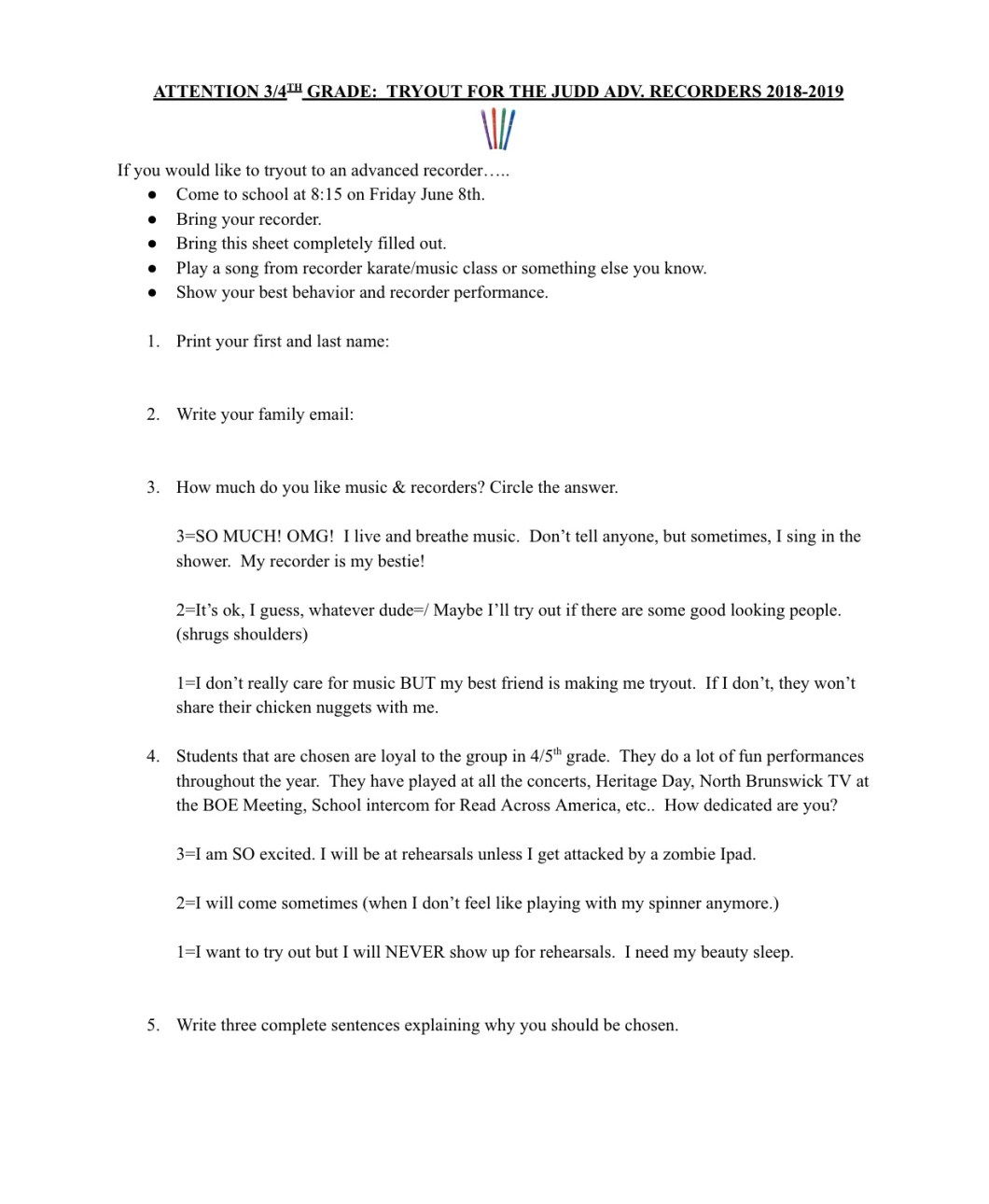 June 5, 2018 Spintoliz Be an advanced recorder!! Tryout on Friday at 8:15! Bring this sheet! Share this: Share on Facebook (Opens in new window) Facebook Share on X (Opens in new window) X Like Loading...