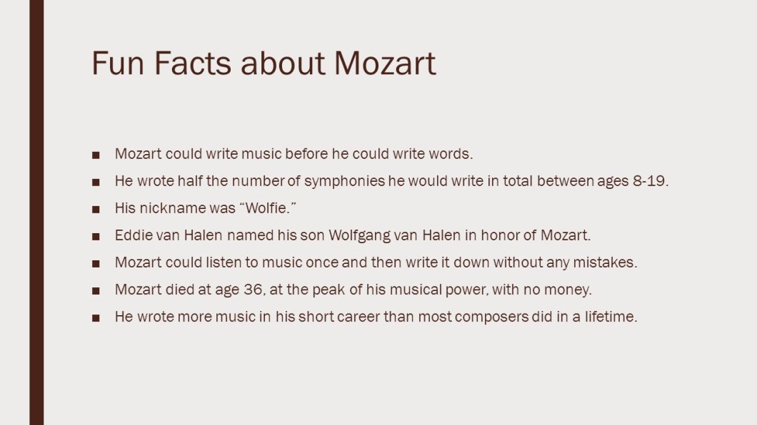 November 1, 2018November 1, 2018 Spintoliz Musical Log Week 5 5th Grade Classical “Eine Kleine Nachtmusik” Mozart https://m.youtube.com/watch?v=FCi2u265wxQ Share this: Share on Facebook (Opens in new window) Facebook Share on X (Opens in new window) X Like Loading...