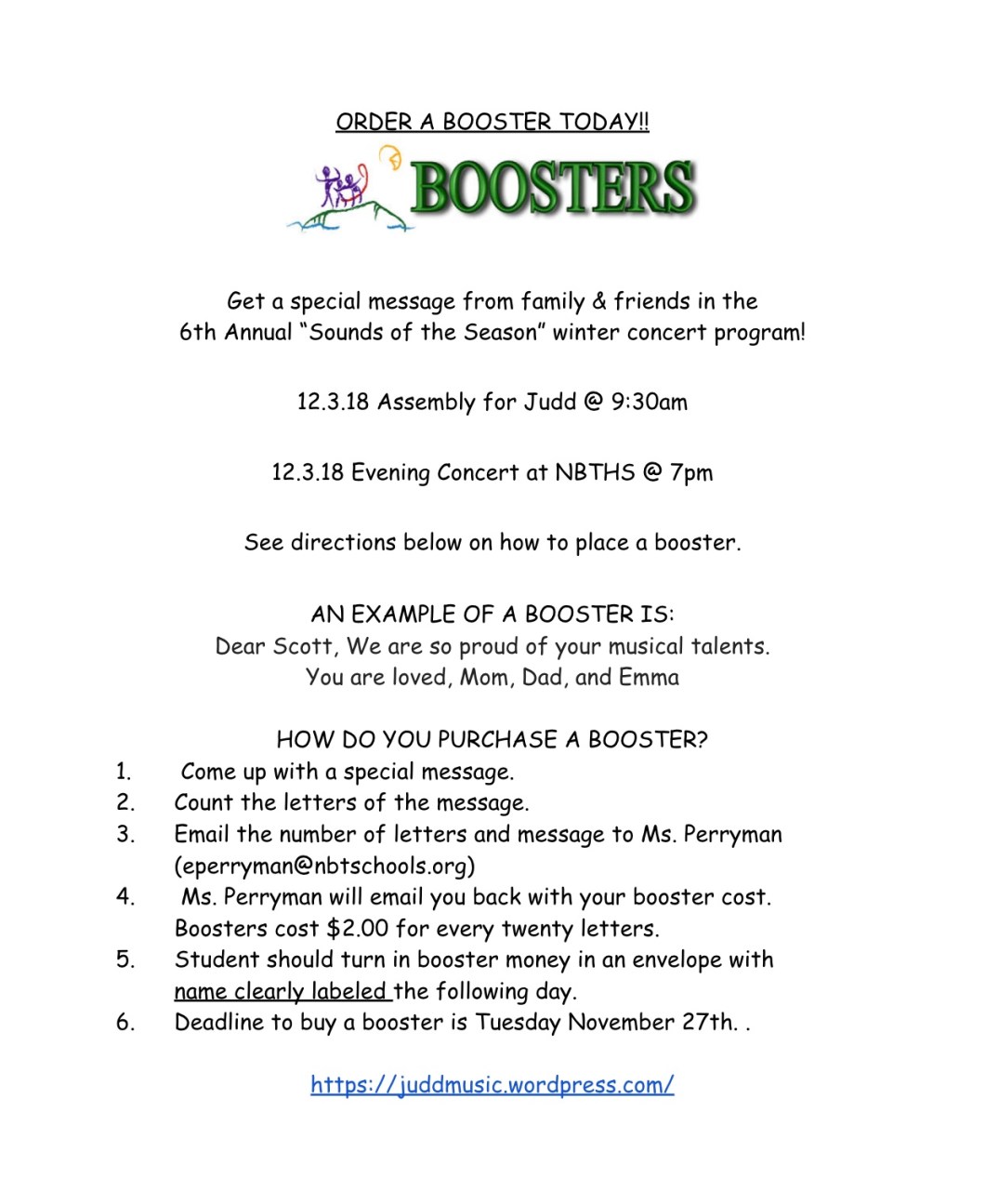 Get a special message from your family in our winter concert program! Have your family email Ms Perryman the message. See attached for information. Boosters due by Tuesday November 27th.