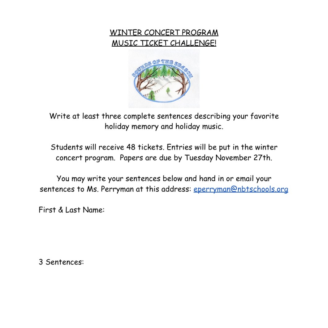 November 19, 2018 Spintoliz 4/5th Grade Winter Concert Ticket Challenge:-) Share this: Share on Facebook (Opens in new window) Facebook Share on X (Opens in new window) X Like Loading...