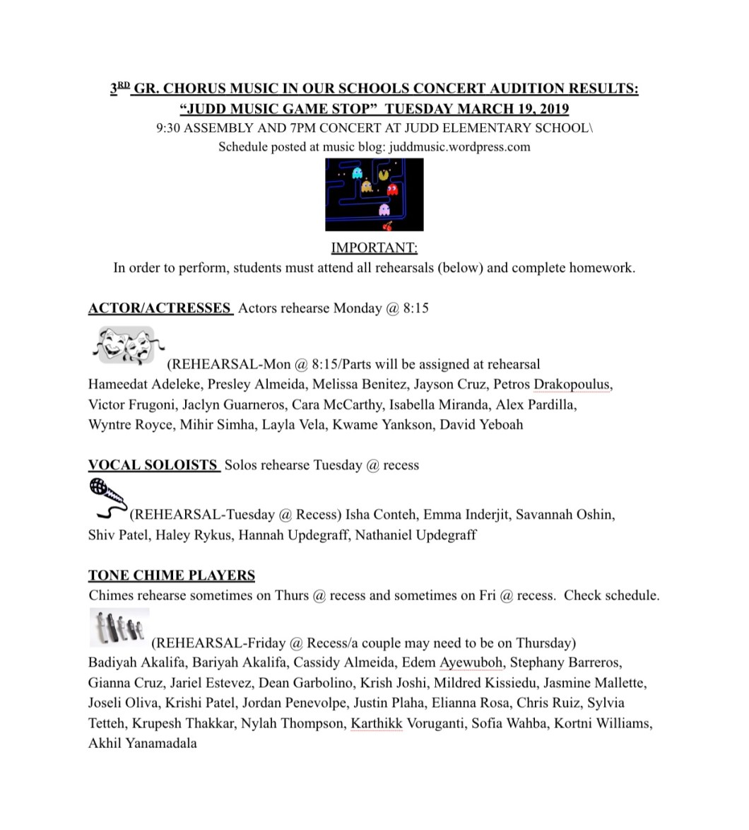 3RD GR. CHORUS MUSIC IN OUR SCHOOLS CONCERT AUDITION RESULTS: JUDD MUSIC GAME STOP” TUESDAY MARCH 19, 2019