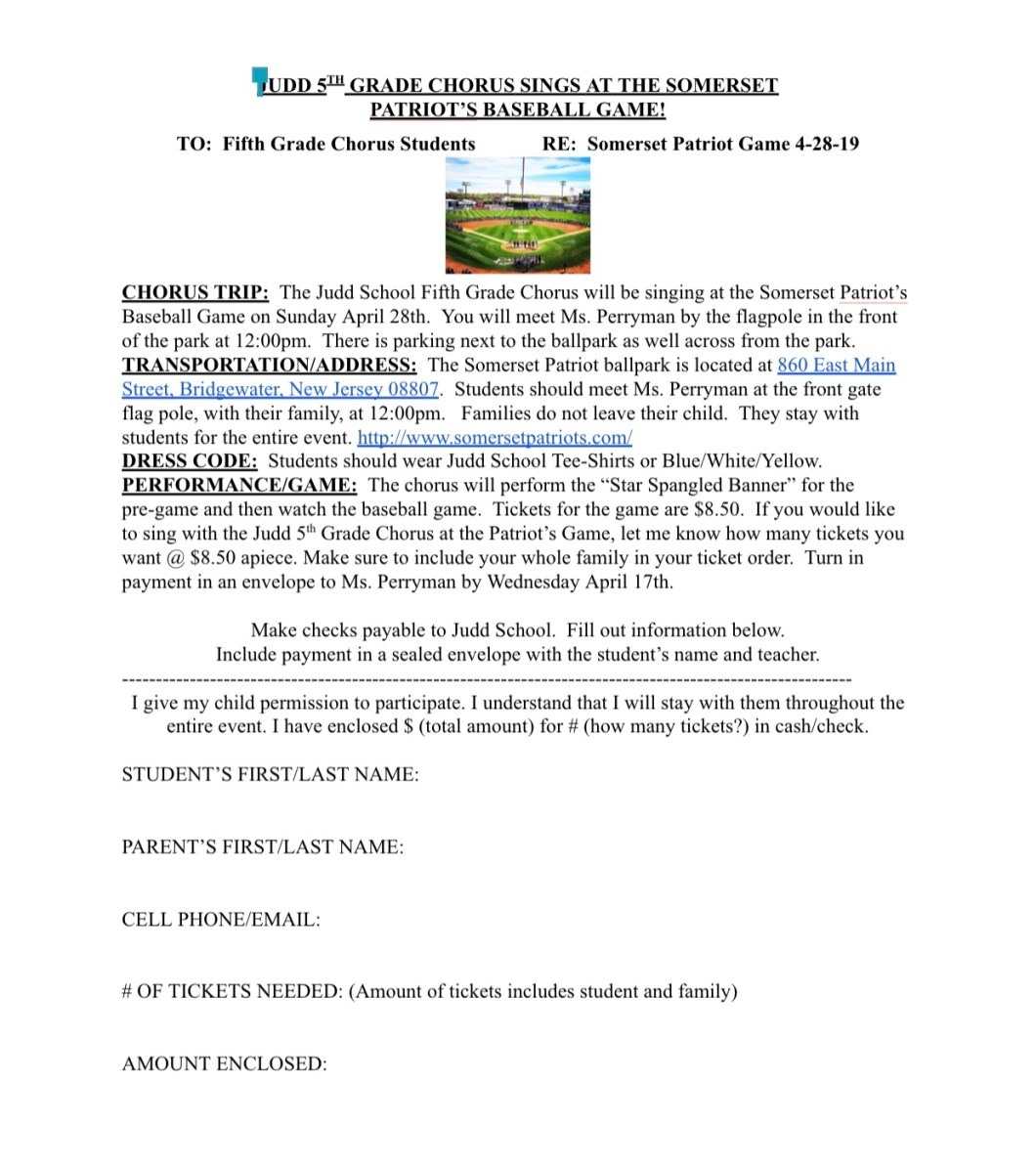 CHORUS TRIP: The Judd School Fifth Grade Chorus will be singing at the Somerset Patriot’s Baseball Game on Sunday April 28th. You will meet Ms. Perryman by the flagpole in the front of the park at 12:00pm. There is parking next to the ballpark as well across from the park.