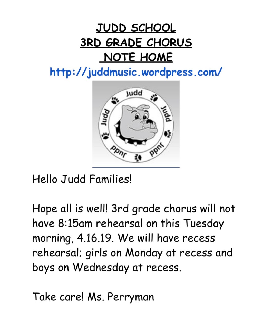 April 15, 2019 Spintoliz No 3rd Grade 8:15 Chorus this Tuesday 4.16.19 Share this: Share on Facebook (Opens in new window) Facebook Share on X (Opens in new window) X Like Loading...