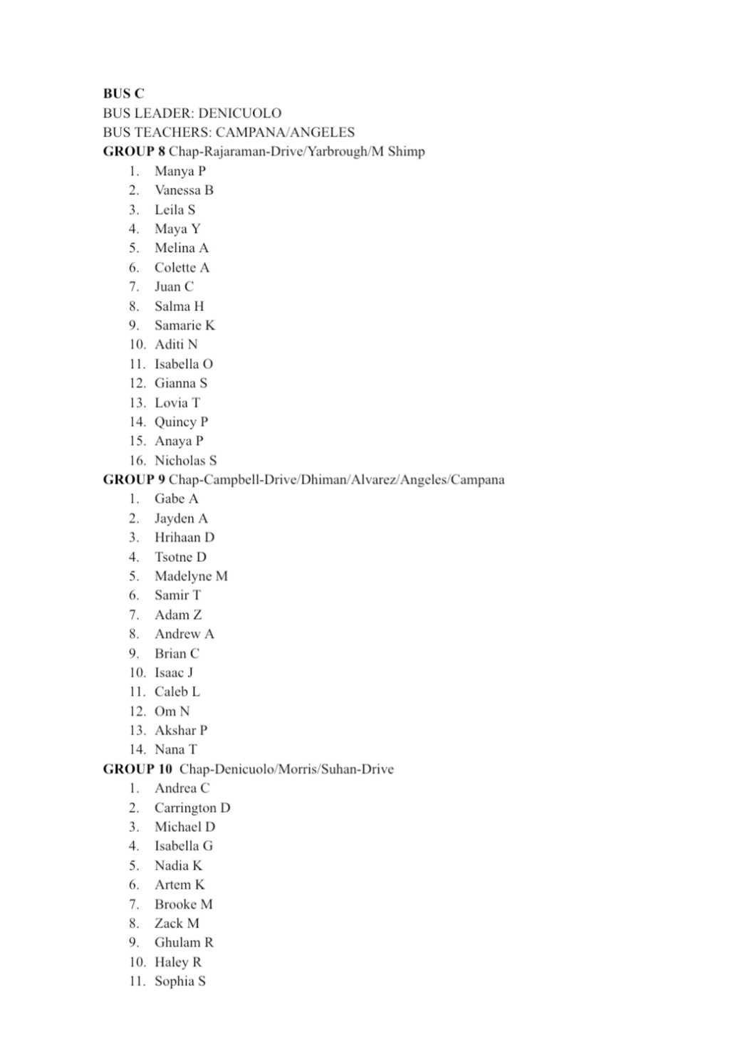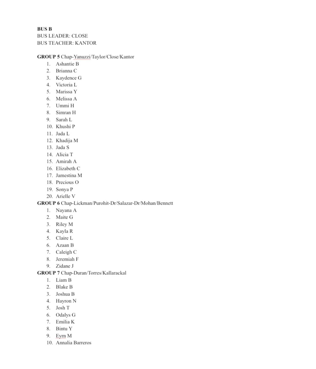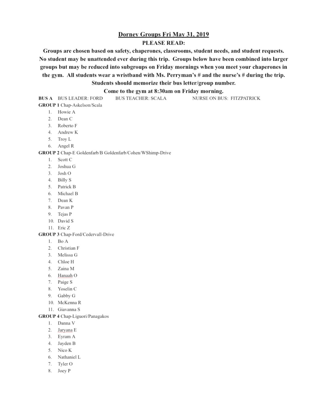 Groups are chosen based on safety, chaperones, classrooms, student needs, and student requests. No student may be unattended ever during this trip. Groups below have been combined into larger groups but may be reduced into subgroups on Friday mornings when you meet your chaperones in the gym. All students wear a wristband with Ms. Perryman’s # and the nurse’s # during the trip. Students should memorize their bus letter/group number. Come to the gym at 8:30am on Friday morning.