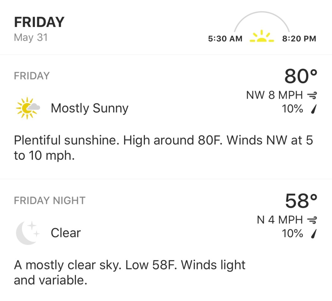 May 29, 2019 Spintoliz Your friendly Friday 5.31.19 forecast…… The weather is looking good for our field trip, 4/5th grade chorus! Whee! Share this: Share on Facebook (Opens in new window) Facebook Share on X (Opens in new window) X Like Loading...
