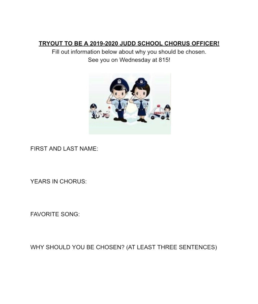 June 3, 2019 Spintoliz CHORUS OFFICER TRYOUTS! Share this: Share on Facebook (Opens in new window) Facebook Share on X (Opens in new window) X Like Loading...
