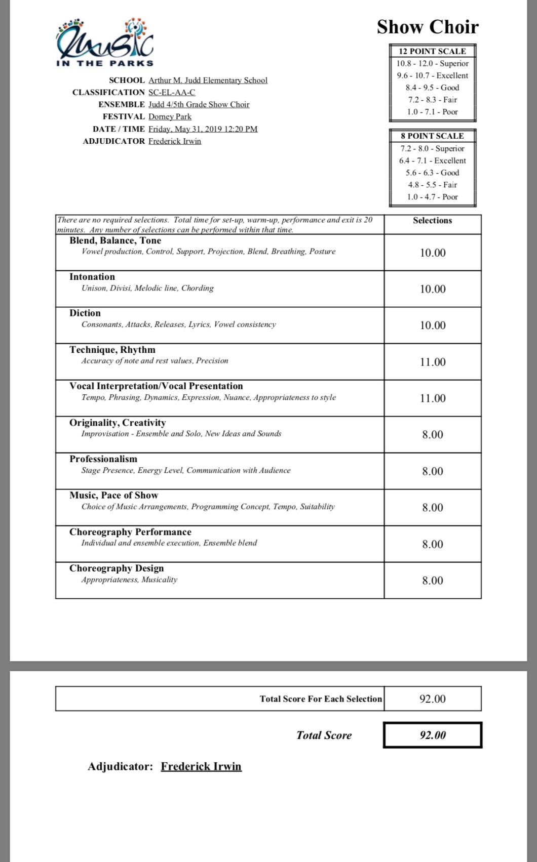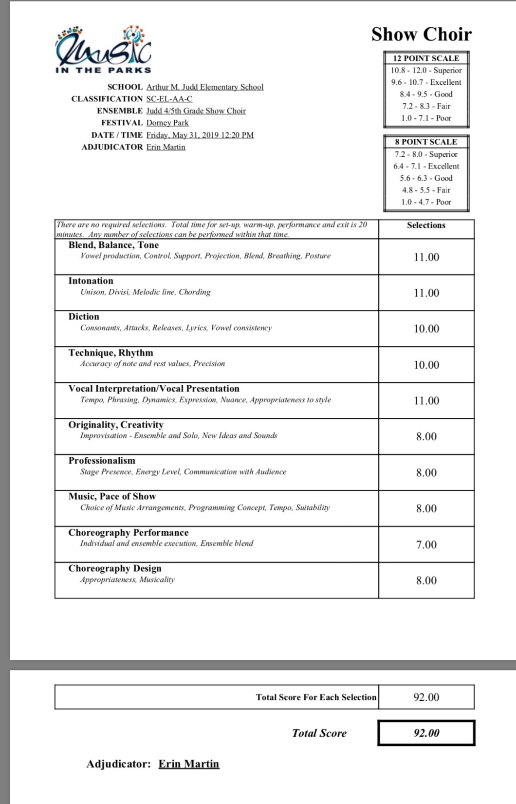Fantastic Job, 4/5th Grade Chorus!! Your scores were really admirable. Our chorus was one of the 3 groups from elementary to high school to receive a superior rating. You should feel very proud of your achievements. See you soon!