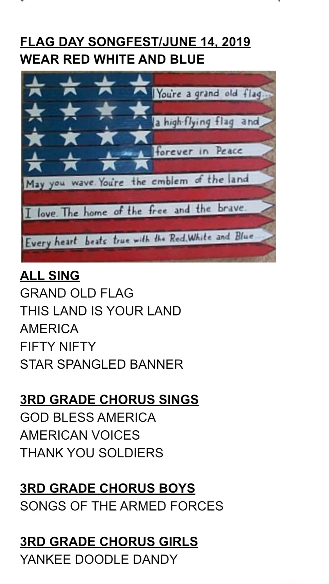 June 13, 2019 Spintoliz K-3 Flag Day Song Fest Tomorrow! #61419 Share this: Share on Facebook (Opens in new window) Facebook Share on X (Opens in new window) X Like Loading...