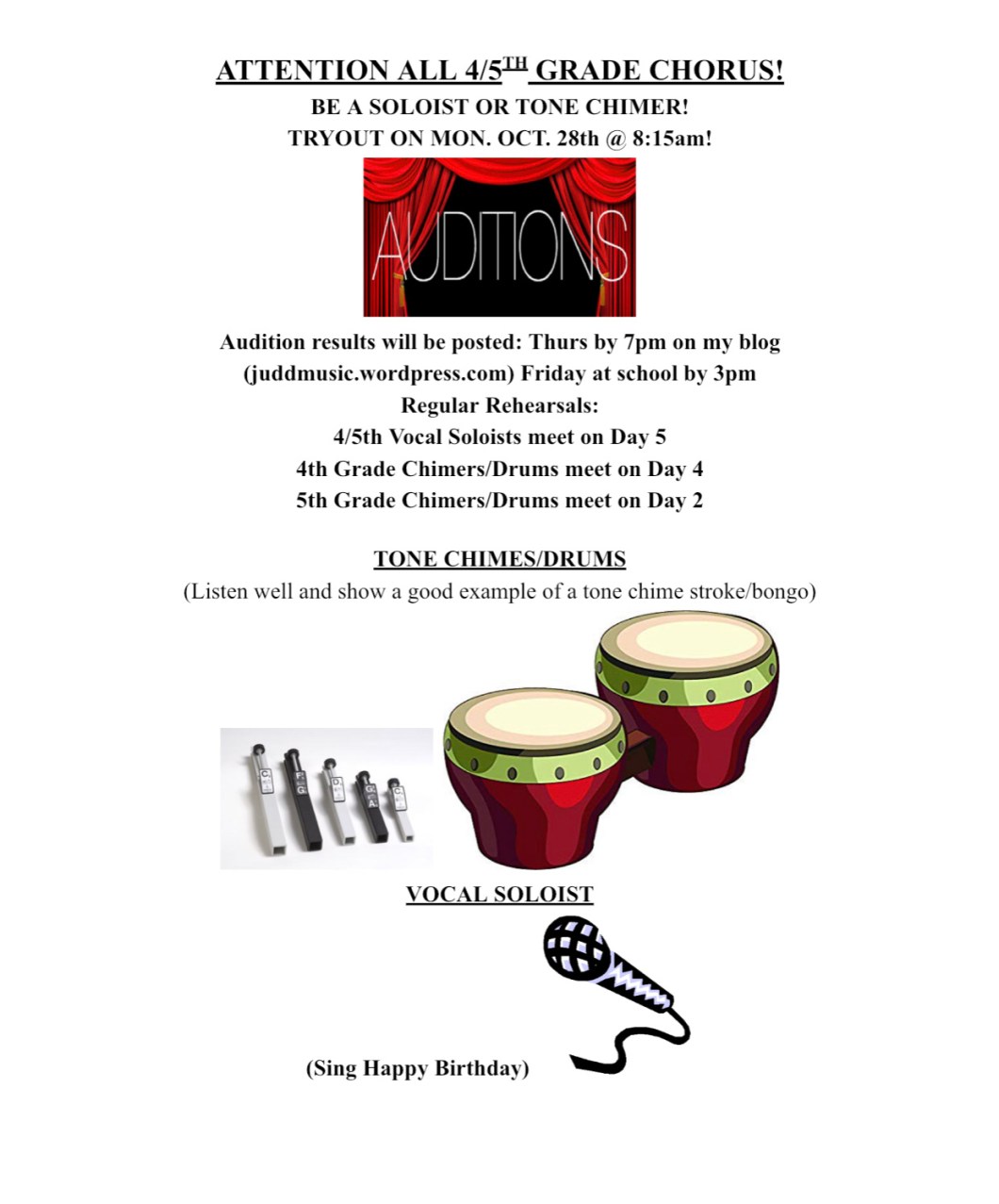 October 21, 2019 Spintoliz Tryout to be a 4/5th grade chorus soloist, tone chimer, and drummer! #20192020 Share this: Click to share on Facebook (Opens in new window) Facebook Click to share on X (Opens in new window) X Like Loading...