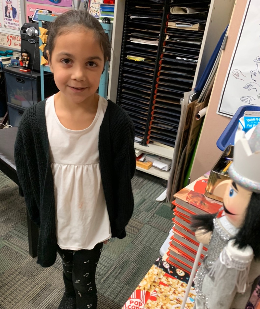 Rock star 1st grade Judd student Corinne wears a perfect white and black chorus outfit with musical pants! Great job earning Mrs. Endler’s class a marble!