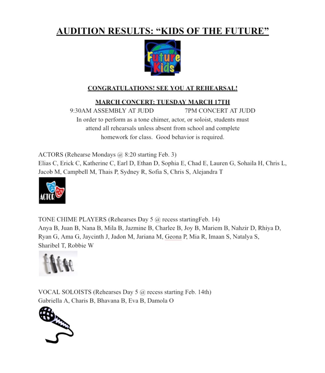 January 30, 2020 Spintoliz 3rd Grade Chorus Audition Results #kidsofthefuture #march2020 Congratulations! See you at rehearsal!! Share this: Share on Facebook (Opens in new window) Facebook Share on X (Opens in new window) X Like Loading...