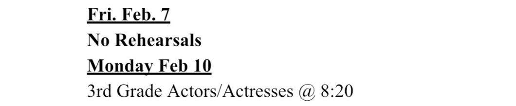 February 6, 2020 Spintoliz Schedule Reminder For Tomorrow: No Rehearsals 2.7.2020 Share this: Share on Facebook (Opens in new window) Facebook Share on X (Opens in new window) X Like Loading...
