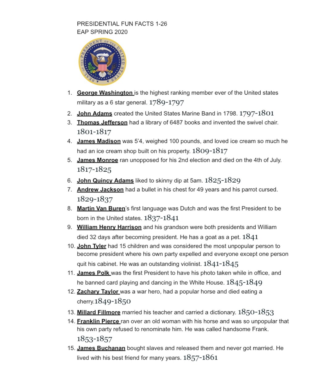 March 8, 2020March 8, 2020 Spintoliz Music Journal 14 #rapofthepresidents22to26 1. Who were the 22-26th US presidents? 2. If you were president, what three things would you want in the White House? Share this: Share on Facebook (Opens in new window) Facebook Share on X (Opens in new window) X Like Loading...