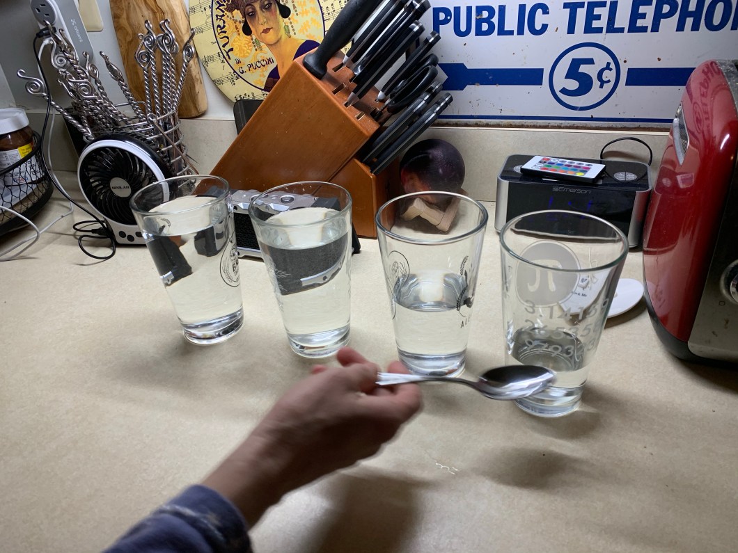 We are learning that glasses filled with water make a sound when you tap on its side with a spoon.