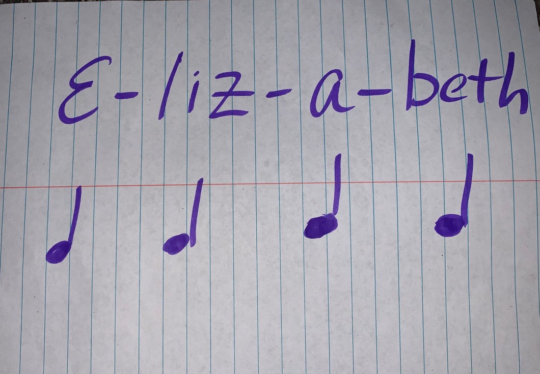 My name is Elizabeth. It makes 4 sounds. Here is my name with music notes.