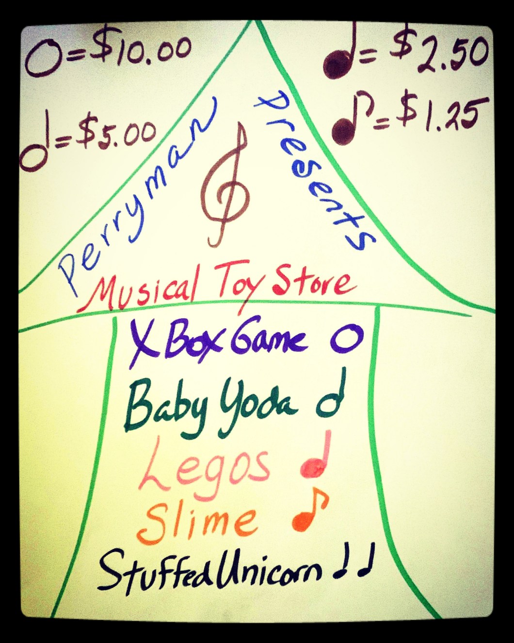 2. Pick a price on each item. (Example-a stuffed 🦄 costs a half note or $5.00)