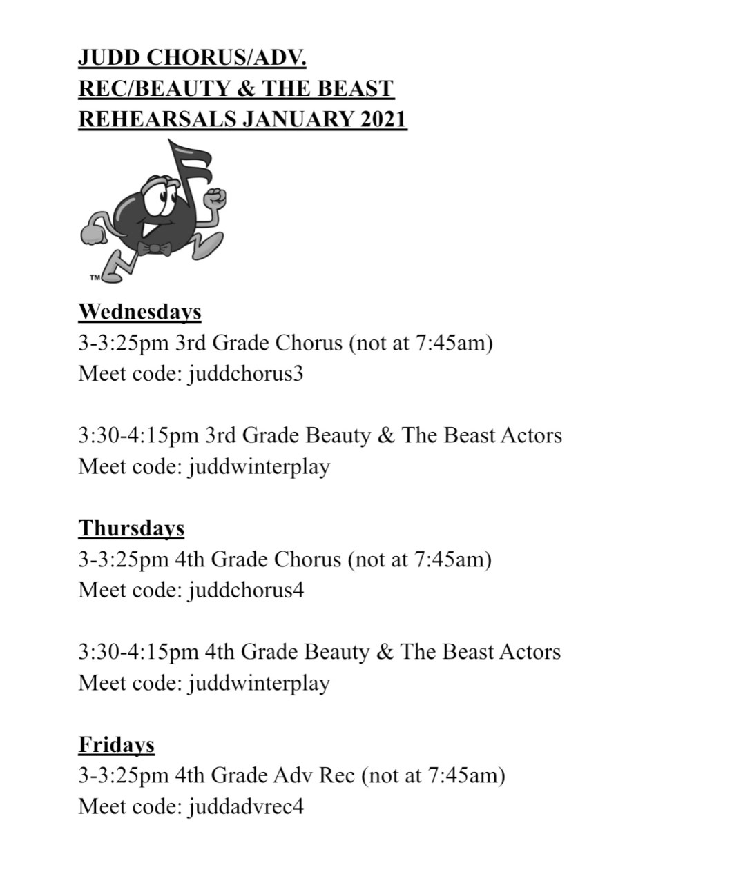 Hello! See our new year schedule! We don’t meet at 7:45am for chorus/4th grade recorders. 3-3:25 is our new time. See you at rehearsal!