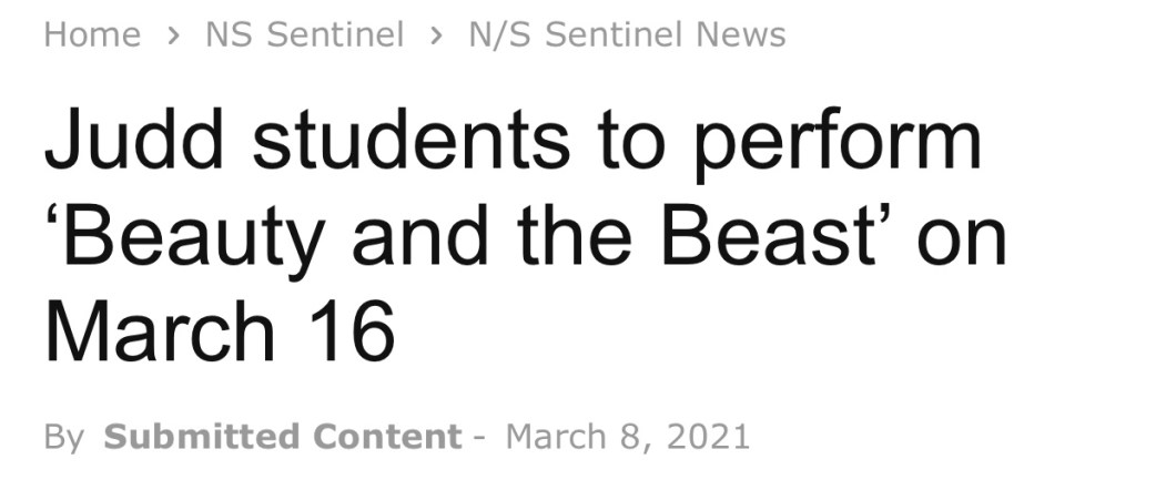 March 17, 2021 Spintoliz Beauty and the Beast in the NJ sentinel! Great job! https://centraljersey.com/2021/03/08/judd-students-to-perform-beauty-and-the-beast-on-march-16/ Share this: Share on Facebook (Opens in new window) Facebook Share on X (Opens in new window) X Like Loading...