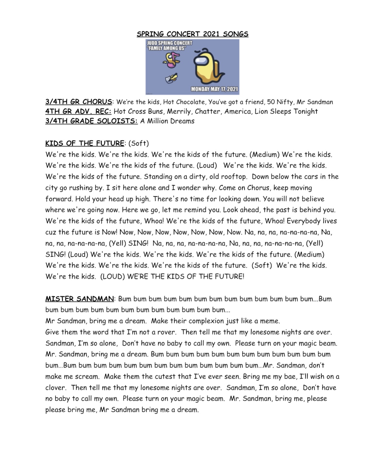 April 27, 2021 Spintoliz 3/4th Grade Spring Concert Song Lyrics #42021 Share this: Share on Facebook (Opens in new window) Facebook Share on X (Opens in new window) X Like Loading...