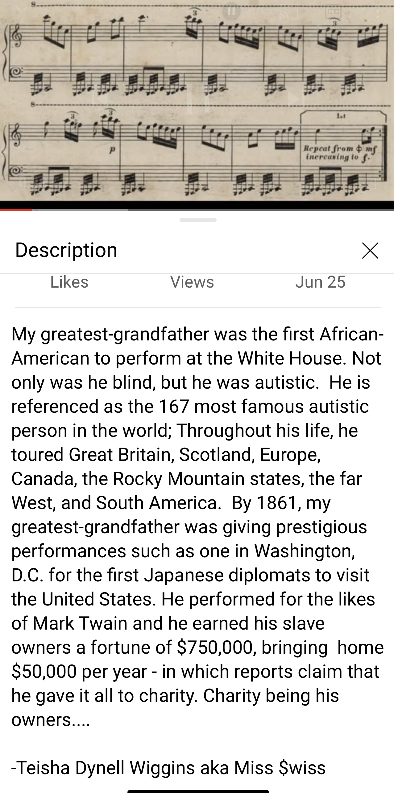 Blind Tom Wiggins gave his last performance in 1905. He died three years later on June 13, 1908 at the age of 59 at his manager’s home in Hoboken, New Jersey.
