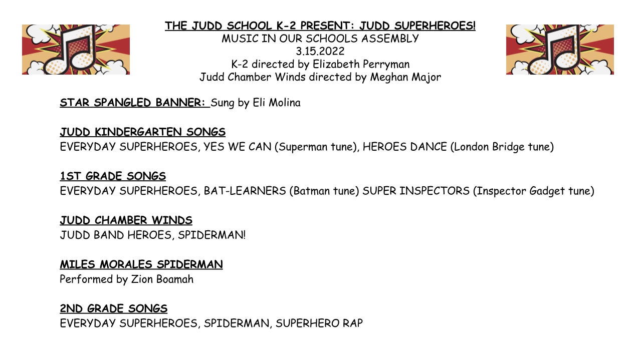 March 9, 2022 Spintoliz Judd Superheroes Assembly Next Tuesday! #32022 #musicinourschools Share this: Click to share on Facebook (Opens in new window) Facebook Click to share on X (Opens in new window) X Like Loading...
