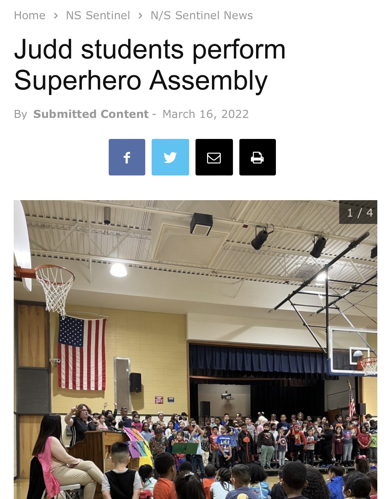 March 23, 2022 Spintoliz Judd K-2 Superhero Assembly newspaper article #3162022 Judd students perform Superhero Assembly Share this: Click to share on Facebook (Opens in new window) Facebook Click to share on X (Opens in new window) X Like Loading...