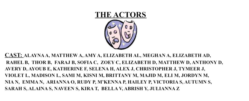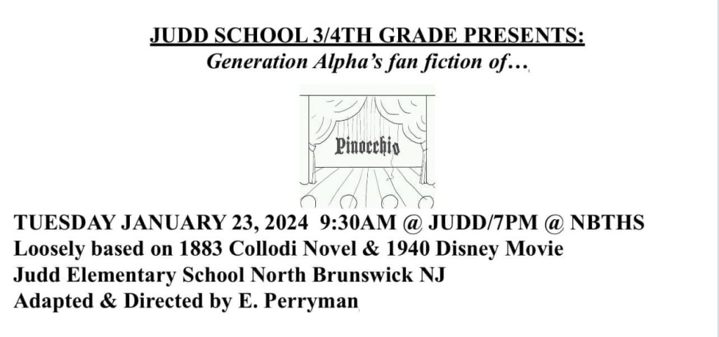 Hello Judd School & Families! Our School Play is here! Actors come to school with costumes at regular time. They will present the show to Judd school students at 9:30am. The performance for families is Tuesday 1.23 at 7pm @ NBTHS. Auditorium doors open for the audience at 6:30pm. Performers should come in costume at 5:30pm.