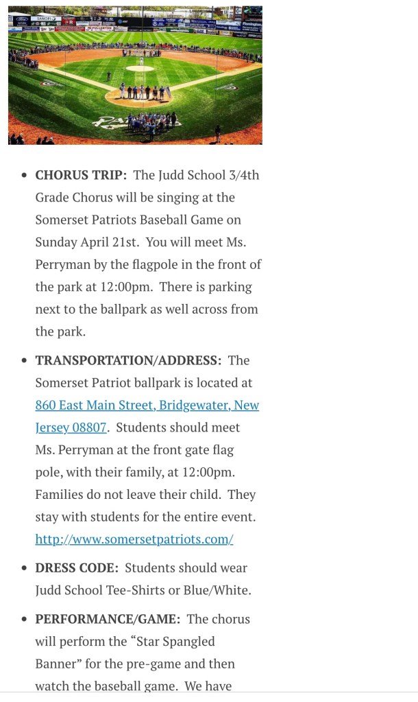 Hello! See you tomorrow at 12 for the chorus singing at the Somerset patriot game! If you got tickets from me, I’ll have them for you by 12. If you need to purchase, you can buy at the box office. Tell them you are from judd chorus for the discount. We meet at 12 at the flagpole. Kids wear Judd shirts. See you soon!