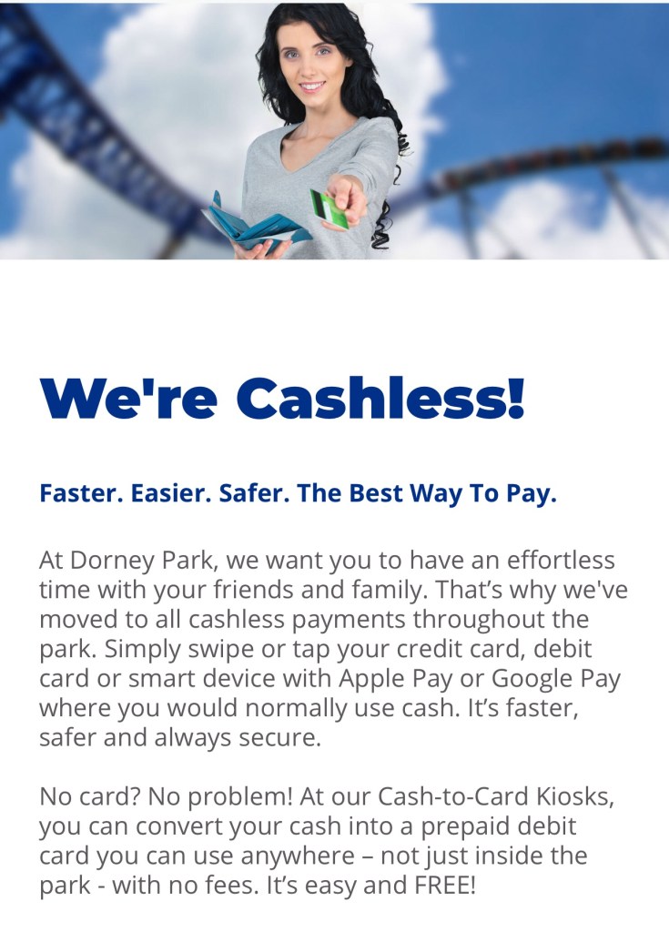 Hello! Just a heads up for 4th Grade Chorus Dorney families. Dorney is cashless. If your child would like to bring money for souvenirs (they don’t need any as dinner is covered), the park has a few kiosks that can exchange cash for a gift card. The lines can get long. They can also bring a visa gift card ahead of time or use Apple Pay. Here’s the details: