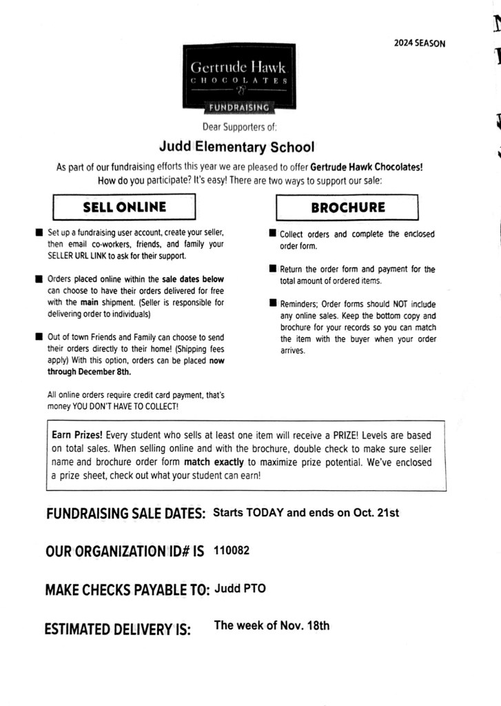 Support our Judd School Chorus on their annual music in the parks field trip by purchasing and or selling some tasty Gertrude Hawk Chocolates! See brochure and how to order details below! All fundraising materials are due to Ms Perryman no later than Monday October 21st at 3pm. Thank you!!!