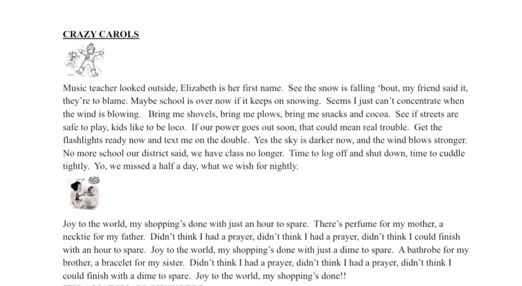 November 5, 2024 Spintoliz 3/4th grade chorus winter concert songs practice recording #112024 Practice audio: https://youtu.be/l0B4g65Qh5Q?si=iA8rmLaQdsDPeRv_ Lyrics: Share this: Click to share on Facebook (Opens in new window) Facebook Click to share on X (Opens in new window) X Like Loading...