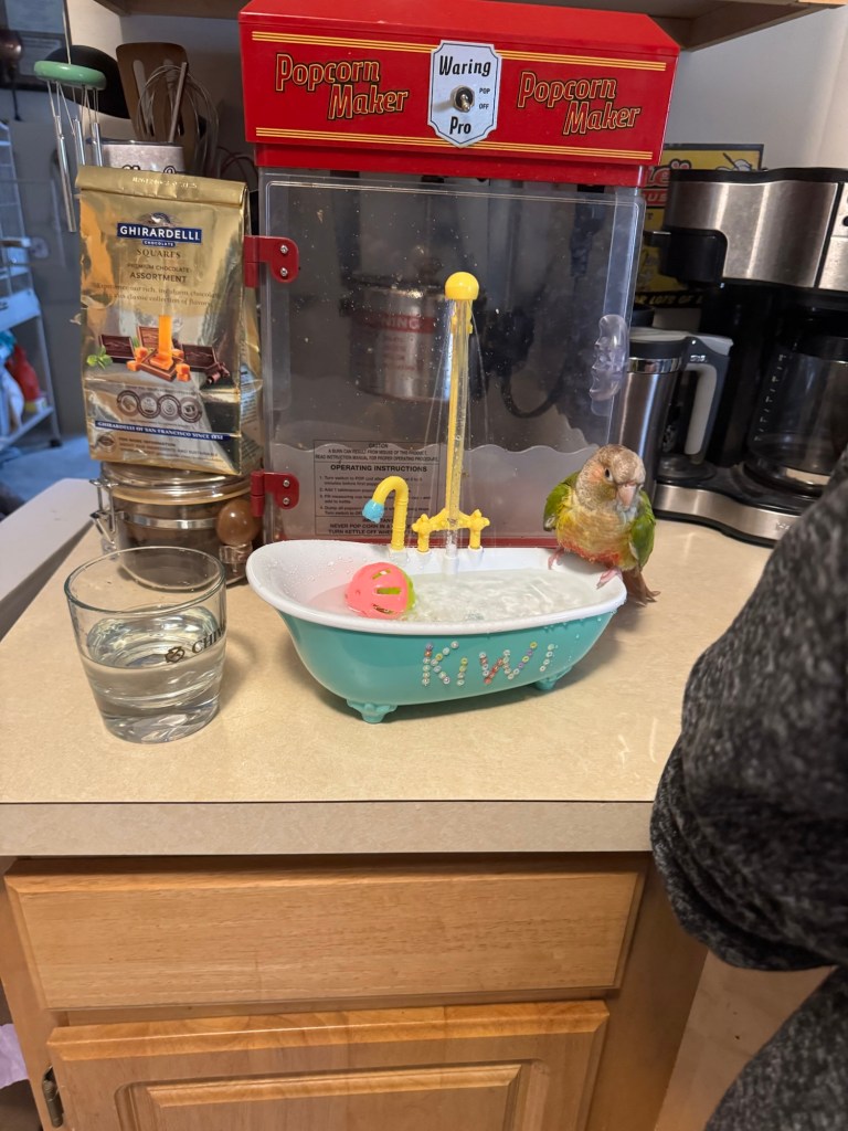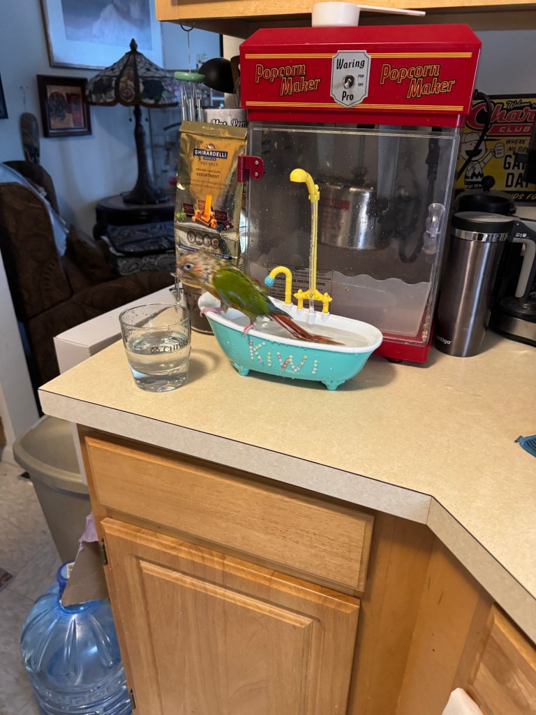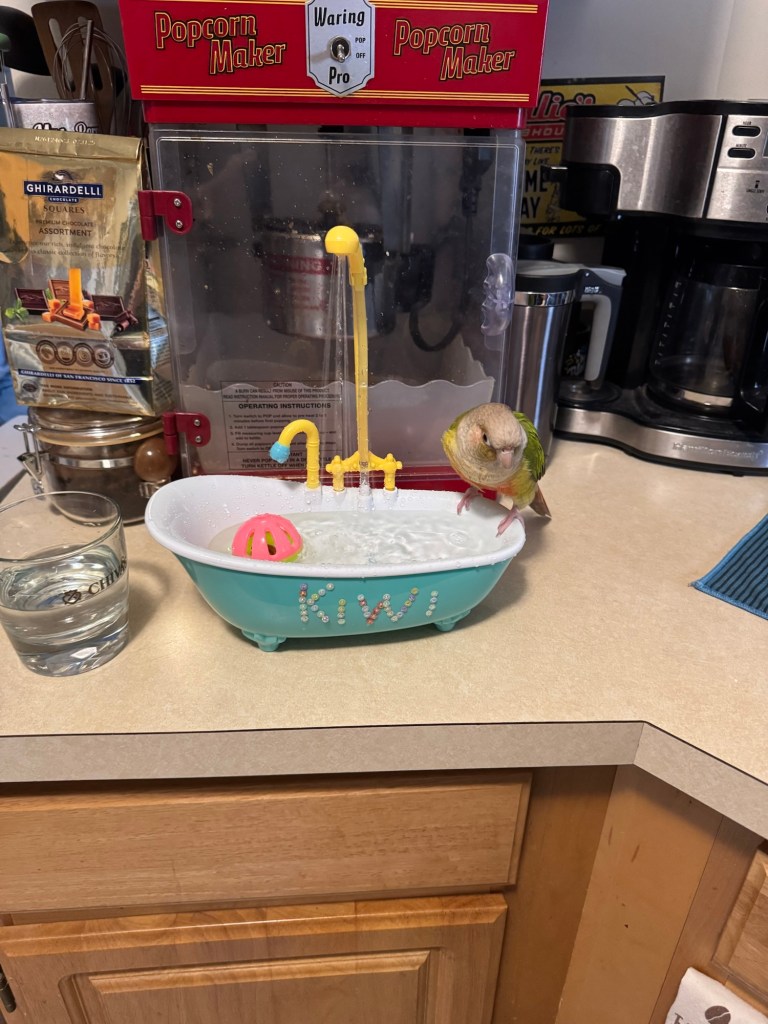 January 18, 2025 Spintoliz Kiwi’s Bath-Time #kiwi #pineappleconure #bathtime #pets #bathtub #parrot #petparenting Kiwi loves taking a bath. She now has her own Kiwi tub. She’s a very clean conure. Share this: Click to share on Facebook (Opens in new window) Facebook Click to share on X (Opens in new window) X Like Loading...