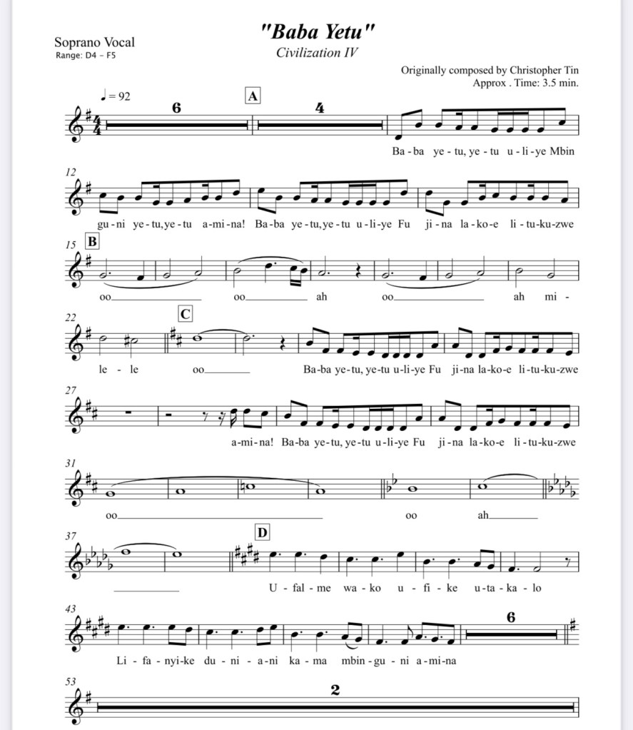 Baba Yetu is a Swahili prayer. It blends African choral music with Western symphonic structure, showing our journey of humanity from the cradle of civilization.