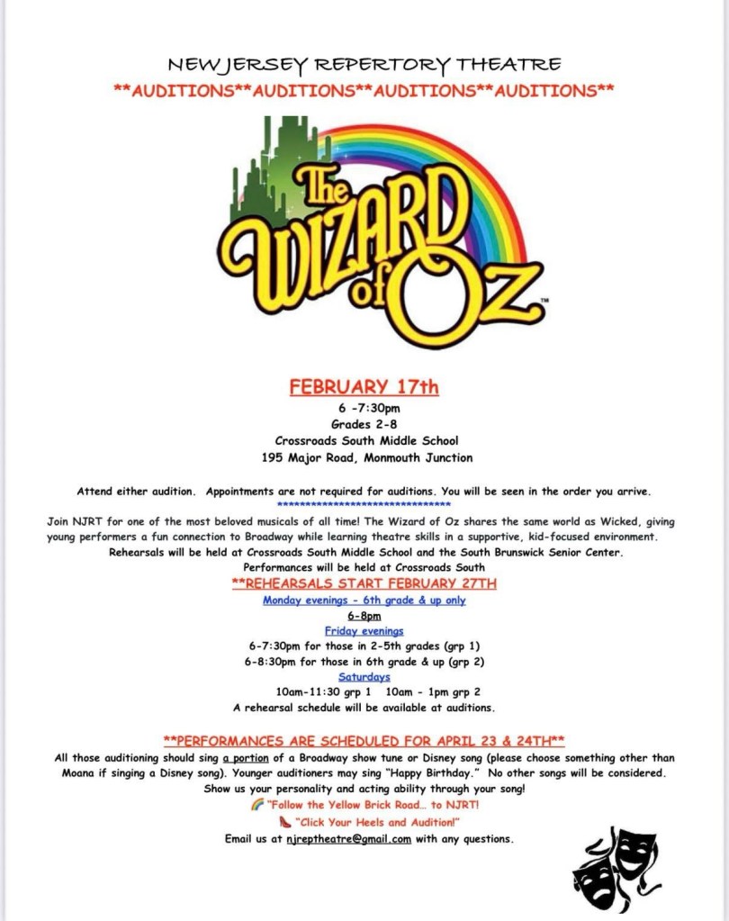 Calling all young performers in grades 2–8! NJRT’s Wizard of Oz auditions are just one week away, and we can’t wait to see your shining stars.
